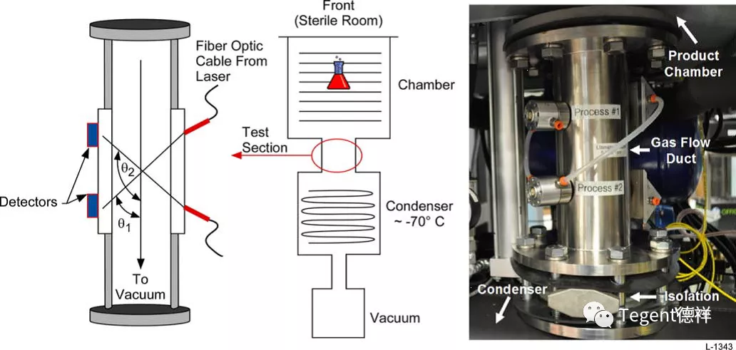 而測試凍干機的極限能力并沒有太多方法,通常使用純水和壓力計進行多次實驗來作為檢測手段。近年來,使用TDLAS(tunable diode laser absorption spectroscopy,可調諧二極管激光吸收光譜法,圖2)可提供水蒸汽濃度和氣體流速的實時測量,可用于凍干機到達極限時的質量流量數(shù)據(jù),為性能測試提供了極大便利,同時,由于該技術有延展性,因此可確保商業(yè)化生產時提供設備性能的可靠數(shù)據(jù)。