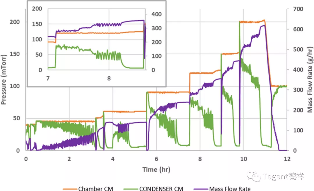 ▲ 圖3:干燥過程中的數(shù)據(jù)用于繪制隨時間變化的壓力和質量流量的關系圖。腔室壓力與冷凝器壓力的比率范圍從大約 8:1 到高達 20:1