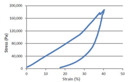 延伸階段以10mm/s的速度將壓頭移動到預估凍干餅高度的5mm以內(nèi);定位階段找到蛋糕的頂部;一旦檢測到頂部,就會開始擠壓凍干餅,然后記錄施加在凍干餅上的力。從圖3(左)可以看出,3%葡聚糖顯示出彈性特性,這個特性由減壓階段從40%應變返回到18%應變的曲線得到證明。