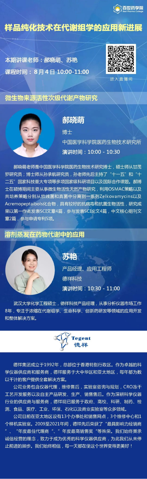 百世藥學(xué)院將于2022年8月4日10:00-11:00特邀請(qǐng)來自中國(guó)醫(yī)學(xué)科學(xué)院醫(yī)藥生物技術(shù)研究所的郝曉萌老師及來自德祥科技的蘇艷老師,圍繞樣品純化技術(shù)在代謝組學(xué)的應(yīng)用新進(jìn)展進(jìn)行線上分享。