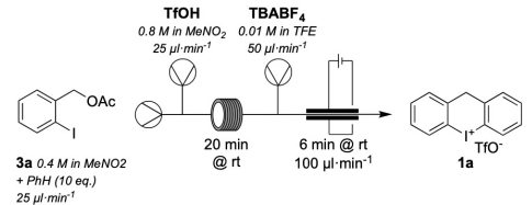 在僅兩當量的TfOH以74%的產率形成產物1a。但是研究人員發(fā)現(xiàn)由于需要額外的苯,這些反應條件不能轉移到多步驟反應中,會形成堵塞流動反應器的黑色沉淀物。