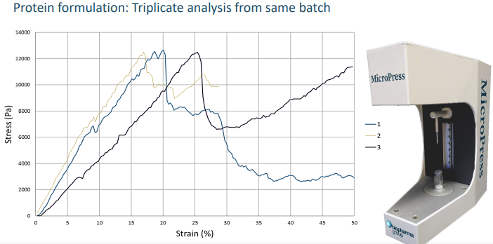 另外,對于凍干輔料對于樣品強度的影響,Micropress也可輕松提供數(shù)據(jù)作為參考。