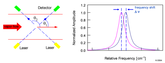 質(zhì)量流量的測定需要測量在測量體積中的氣體流速。速度測量的概念是基于多普勒頻移吸收測量, (如圖1所示)。速度是由激光傳播矢量k和已知角度θ引起的水蒸氣的多普勒位移吸收光譜確定的,氣體流速矢量u。吸收光譜相對于靜態(tài)氣體樣品的吸收波長在波長或頻率上移位,其偏移量與氣體的速度u和u與探測激光束傳播矢量k之間的角度有關(guān)。使用橫跨連通這軸的兩個視線測量,用一個測量路徑與閥芯內(nèi)的第二個路徑進行比較來測量頻移,并由方程式(2)來描述: