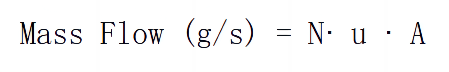 瞬時質(zhì)量流量(dm/dt,g/s)由方程式(3)確定,dm/dt由測量數(shù)密度(N,gcm^(-3))、氣體流速(u, cm/s)、通道截面積(A, cm2)和若干單位換算因子的乘積計算而得: