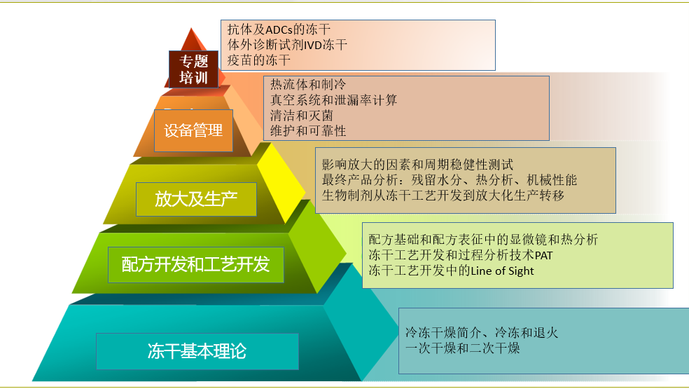 基于這些考量,萊奧德創(chuàng)創(chuàng)建了金字塔凍干培訓(xùn)平臺,從凍干理論基礎(chǔ),到配方和工藝開發(fā),再到放大及生產(chǎn),以及進(jìn)階的設(shè)備管理和線上線下專題培訓(xùn)課程。