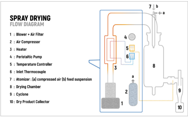 噴霧干燥通常被認(rèn)為是一個更簡單(和更快)的過程,涉及在一個步驟中將液體制劑轉(zhuǎn)化為干粉。溶液被霧化成細(xì)小的液滴,然后在一個大室中使用熱氣體快速干燥。然后用旋風(fēng)分離器收集所得干燥顆粒。