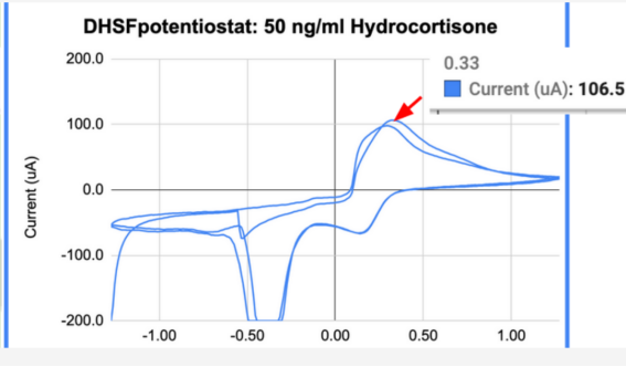 以下是三張具有代表性的人工汗液測試溶液的數(shù)據(jù)圖(由Pickering實驗室提供的人工汗液測試)。他們表明,Margaret開發(fā)的汗液皮質(zhì)醇生物傳感器可以檢測皮質(zhì)醇標準,皮質(zhì)醇濃度水平與當(dāng)前峰值之間存在正相關(guān)。