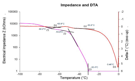 如圖所示,Zsinφ(Z1) 中顯示的穩(wěn)定性與 DTA(D1) 的放熱事件有關(guān)。溶質(zhì)在 -53.0°C (Z2) 時(shí)開始溶解,在 -30.4°C (Z3) 時(shí)達(dá)到最大遷移率。同時(shí),當(dāng)溶解在 -0.46 °C (D3) 下完成時(shí),本體開始緩慢溶解。