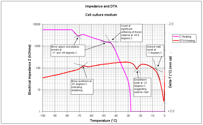 Lyotherm是最新的分析技術(shù)、阻抗分析(Impedance analysis)與傳統(tǒng)差熱分析(Differential thermal analysis, DTA)的獨(dú)特組合。該儀器可以識(shí)別樣品中的電和熱變化,通過結(jié)合差熱分析 (DTA) 和阻抗分析來得到Tg' ,這使得研究者可以更完整地了解樣品的熱和電特性。這些技術(shù)使用兩種不同的視角來增強(qiáng)分析數(shù)據(jù),為分析提供額外的維度,從而允許使用者進(jìn)行更詳細(xì)和更準(zhǔn)確的分析。
