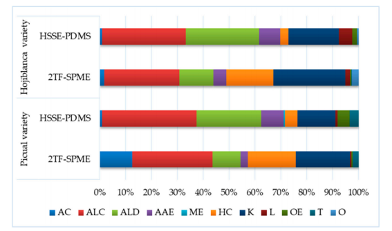 圖2:通過HSSE-PDMS和2TF-SPME獲得的EVOO Picual和Hojiblanca品種主要化學(xué)基團的總峰面積值的百分比