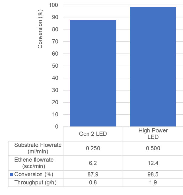 圖5總結(jié)了反應條件以及結(jié)果,在使用高功率LED時,實現(xiàn)了2.8 g/h的產(chǎn)量。
