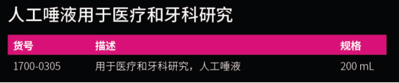 此配方人工唾液根據(jù)醫(yī)療和牙科的參考文獻(xiàn)配制。配方成份與可用于治療口腔干燥癥的商用產(chǎn)品類似。這個即用溶液加入了羚甲基纖維素鈉來增加粘度使它更像是人類的唾液。該配方PH值為6.8,可以存儲在室溫。此溶液只用于醫(yī)療和牙科產(chǎn)品的測試研究,不直接做醫(yī)療用途。