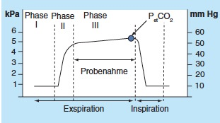 圖1:通過二氧化碳示蹤識(shí)別呼吸階段和控制肺泡取樣。I+II+III 期=呼氣期(“混合呼氣期”),III 期=肺泡/潮氣期。PetCO2=潮汐末二氧化碳分壓