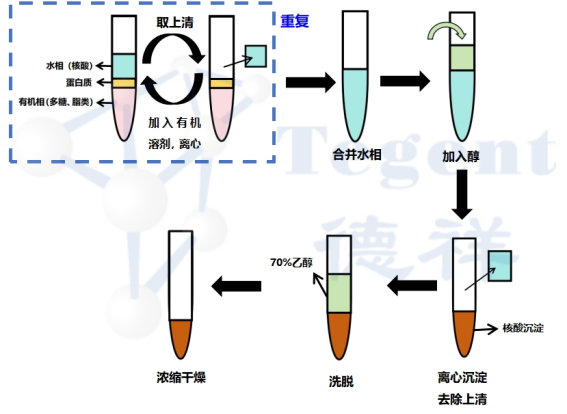 經(jīng)典的DNA提取方法:酚氯仿抽法,主要是使用兩種不同的有機(jī)溶劑交替抽提將蛋白去除。通過苯酚氯仿處理細(xì)胞破碎液或者組織勻漿后,在水相中主要溶解的是以DNA為主的核酸成分,在有機(jī)相中主要是多糖和脂類物質(zhì),蛋白質(zhì)則沉淀于兩相之間。離心分層后取出水層,多次重復(fù)操作,再合并含核酸的水相,利用核酸不溶于醇的性質(zhì),用乙醇沉淀核酸,之后再離心分離和溶解洗脫,而后通過將洗滌后的核酸沉淀進(jìn)行濃縮干燥即可得到高純度核酸。
