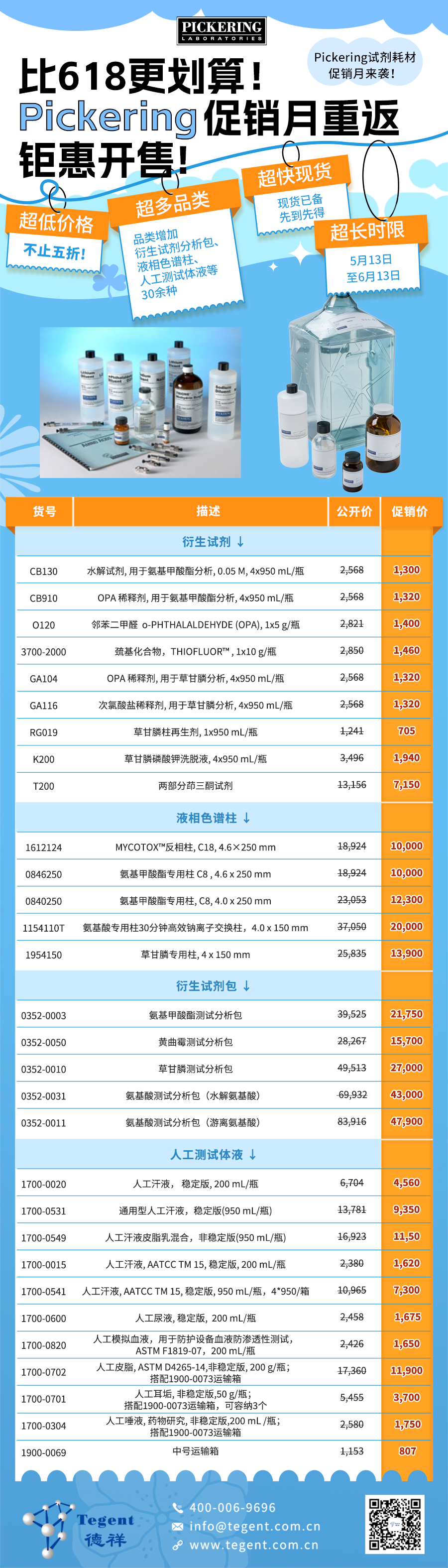 德祥科技資深合作伙伴,美國Pickering Laboratories公司是一家全球?qū)I(yè)提供人工測試體液和柱后衍生化學(xué)試劑、色譜柱、分析方法等柱后衍生分析整體解決方案的機構(gòu),其多款產(chǎn)品受到德祥新老客戶的好評,多次推出的促銷月活動也讓產(chǎn)品更具性價比!此次促銷月活動再度來襲,品類更多,優(yōu)惠更大!
