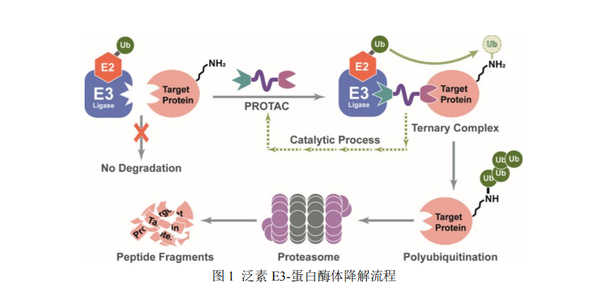 PROTAC(Proteolysis Targeting Chimera)是一種雙功能小分子化合物,該小分子化合物類似一個蹺蹺板,一端是結(jié)合靶蛋白的配體,另一端是結(jié)合 E3 泛素連接酶的配體,配體之間通過一個 linker 連接,形成一個復合物,拉近靶蛋白與 E3 連接酶從而促進靶蛋白的泛素化,使其進入泛素-蛋白酶體降解途徑,達到降解靶蛋白的目的。由于這一特性,Protac 技術(shù)可以轉(zhuǎn)化很多不可成藥性的靶點。