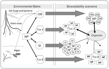 圖1.納米粒子(NP)與毒物(Tox A和B),鹽離子(SI)和有機物質(zhì)(OM)(如腐殖酸或植物,真菌,細(xì)菌和藻類釋放的化合物)相互作用的情景。