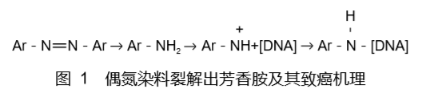 對此,電磁屏蔽材料在紡織物的運(yùn)用上應(yīng)運(yùn)而生。但是在生產(chǎn)過程中,芳香胺聚合單體未清洗干凈,會造成對成品的污染,雖然許多該類電磁屏蔽紡織品作為工業(yè)用不直接與人體接觸,但在密閉的工作環(huán)境里,可能增加對人體危害的風(fēng)險,所以應(yīng)該考慮限定該類產(chǎn)品的芳香胺殘余量。芳香胺的毒性研究最早起源于偶氮染料(AZO)致癌機(jī)理的研究,現(xiàn)在其致癌機(jī)理比較清楚(圖1)